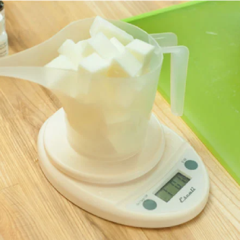 سپس قطعات پایه صابون را به اندازه مورد نیاز وزن کرده و ذوب میکنیم. برای ذوب کردن پایه صابون هم میتوانید از روش بخار آب جوش استفاده کنید هم مانند تصویر پایه را در مایکروویر به مدت ۱ دقیقه قرار دهید.