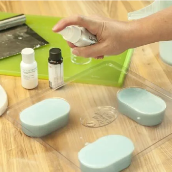 نکته مهم در این مرحله ان است که قالب سیلیکونی را قبل و بعد از ریختن مواد صابونی با الکل ایزوپروپیل یا الکل ۹۶ درجه اسپری کنید. به این ترتیب حبابهای روی صابون با اسپری الکل از بین میرود و صابون فرم زیباتری به خود میگیرد.