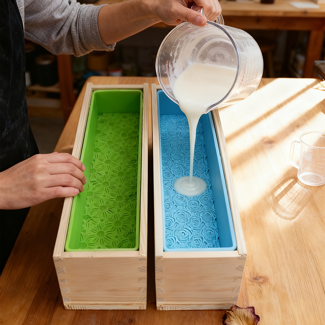 از انواع قالبهای صابونسازی بسته به سلیقه خودتان می توانید استفاده کنید. مهم این است که درست مانند ظروف مورد استفاده به هیچعنوان از قالبهای فلزی استفاده نکنید. قالبهای صابونسازی در انواع سیلیکونی، چوبی، استیل قابل تهیه هستند. این قالبها یا مثل تصویر سمت راست صابون ها را به شکل تک عددی به دست میدهند یا مثل تصویر سمت چپ به صورت بلوکی.